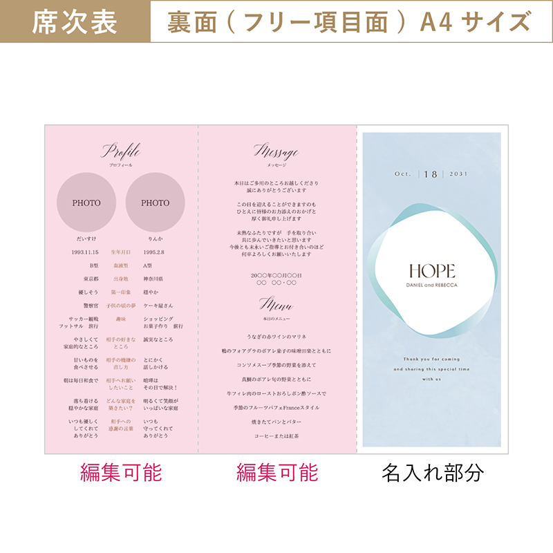 おふたりのプロフィールに加え、メニューやタイムラインなどが印刷できます。