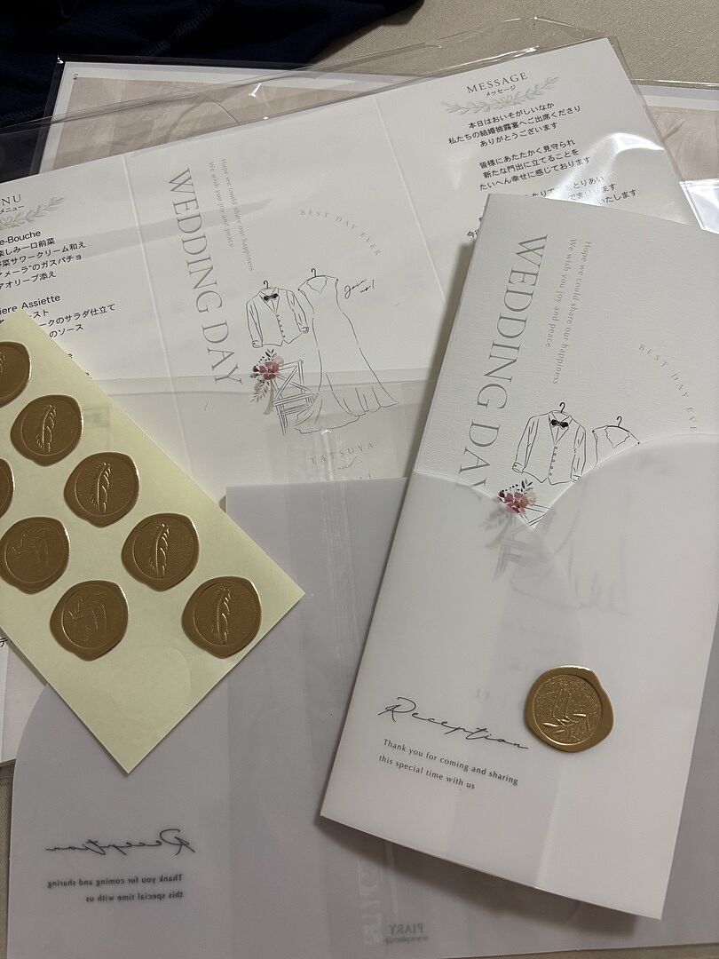 今回は友人に頼まれて制作したのですが、キャンペーンでいろいろ込み込みでかなりお得に注文できました。トレーシングペーパーや箔押しなど手作りでは作れない品質で、紙質はしっかり厚みがあり淡いベージュ系の落ち着いた優しい色合いでほんのりザラッとしたナチュラルな手触りのもので、お値段以上の仕上がりだと思います。 組み立ても簡単で半日ほどで出来たそうです。 席札もトレーシングペーパーで素敵なのですが、メッセージを書くには油性ペンが必要です。ただ書いた文字が透けてしまうので、別にメッセージカードを購入し、内側にシールで留めるという方法にしました。