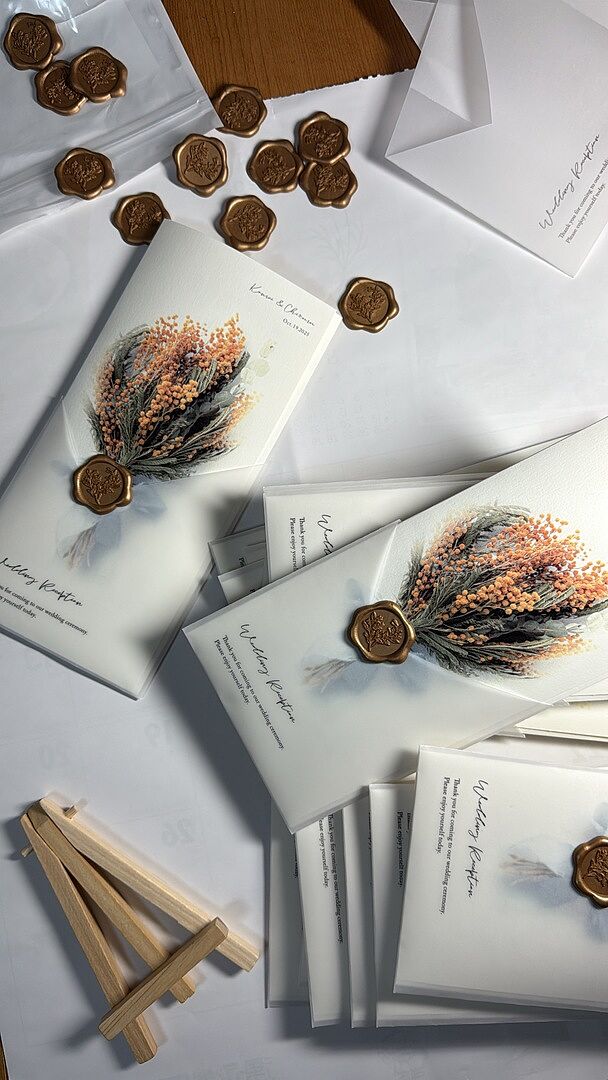 お花のブーケが描かれた席次表を用意して、テーブルはゴールド系統で揃えました。 画像で見るより紙の厚さもしっかりしていて、綺麗に印刷されていました。ミモザ以外のお花の他に3種類取り寄せ、席次表を準備しましたが並べて見たらとてもお洒落かつ可愛くて大満足です!!!!何種類かお花を揃えた方が鮮やかで素敵でした。 シールは、自分でゴールドのワックスシールを注文し貼り付けましたが、プランナーさん・友達からはあまり見たことがなくて可愛らしいと大好評でした!!