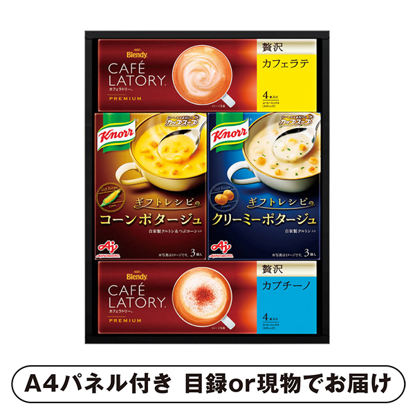 朝食や間食などさまざまなシーンで、お子様から大人まで幅広く楽しんでいただける〈ギフトレシピ〉の「クノール(R) カップスープ」と「ブレンディ(R)カフェラトリー(R)」スティック プレミアムのギフトです。
