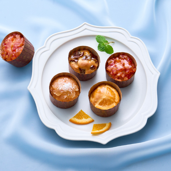 艶っと光るシロップ漬けの果実や、セミドライの果実がジュエリーのようなカップケーキです。空気をたっぷり含ませて焼きあげた、果実入りのなめらかな生地に煌めく果実たちをトッピングして、果実を味わうカップケーキに仕上げました。