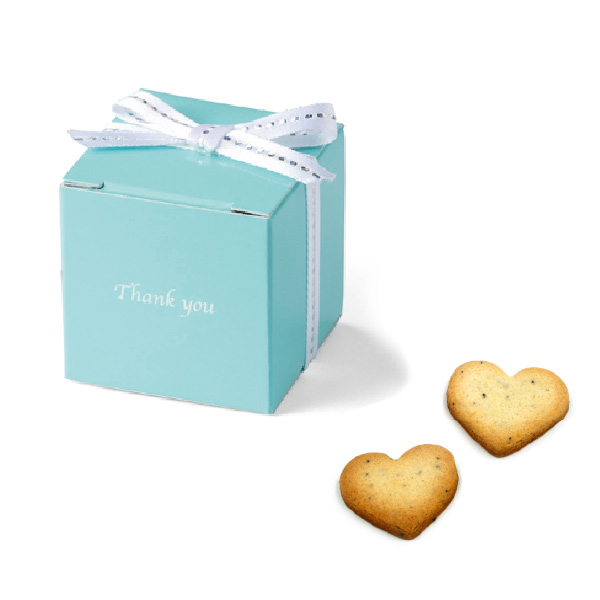 澄み渡る青空のようなセルリアンブルーの小箱に、ハート型の紅茶クッキーを詰めたプチギフト。清楚で上品なカラーが会場を爽やかに彩ります。ゲストさまへの感謝の気持ちを届けるプチギフトです。