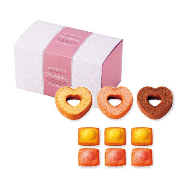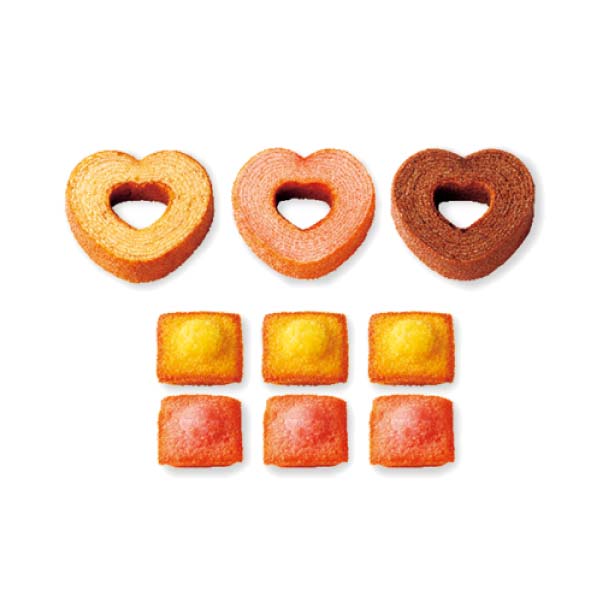 | 商品内容 | ハートミニバーム(プレーン・ストロベリー・チョコ)×各1個、ミニマドレーヌ(バナナ・ストロベリー)×各3個 |