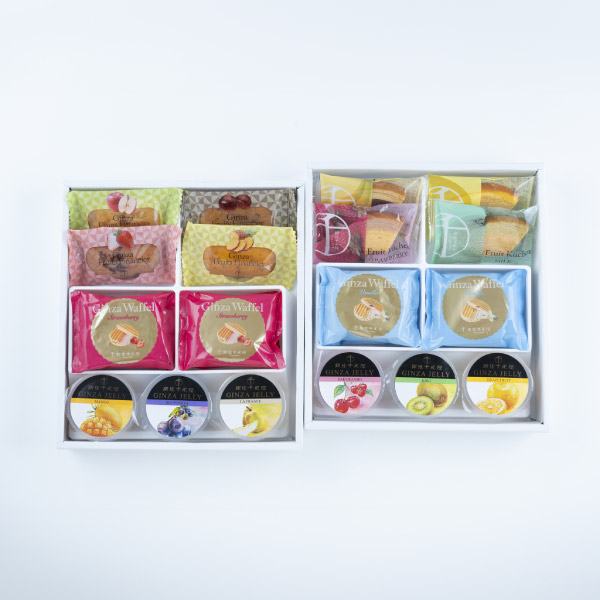 | 商品内容 | 銀座ゼリー(ラ フランス・マンゴー・キウイ・グレープフルーツ・ブルーベリー・さくらんぼ×各1)、銀座フルーツフィナンシェ(ストロベリー・パイナップル・アップル・マロン×各1)、銀座ヴァッフェル(バニラ・いちご×各4)、銀座フルーツクーヘン(イチゴ&ミルク・レモン&はちみつ・メロン&ミルク・バナナ&チョコ×各1) |