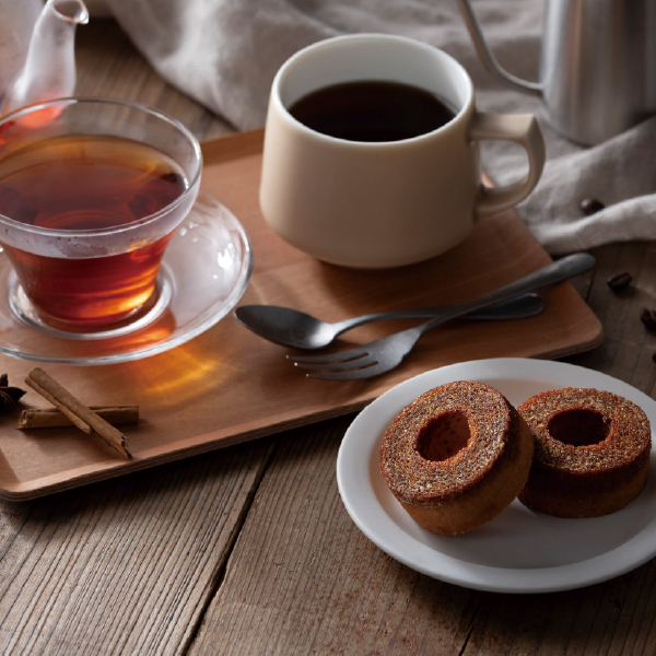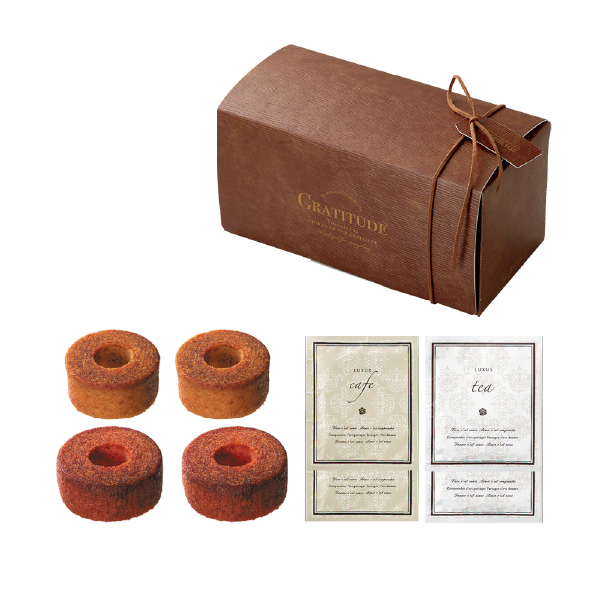 ほっと一息のカフェタイムに、甘いバームクーヘンと香り豊かなドリンクをお届けします。高級感のあるレザー調のお洒落なペーパーボックスに、品のあるキャラメリゼバームクーヘンとコーヒー、紅茶が各2個入っています。心を満たすあたたかなカフェタイムをプレゼントします。
