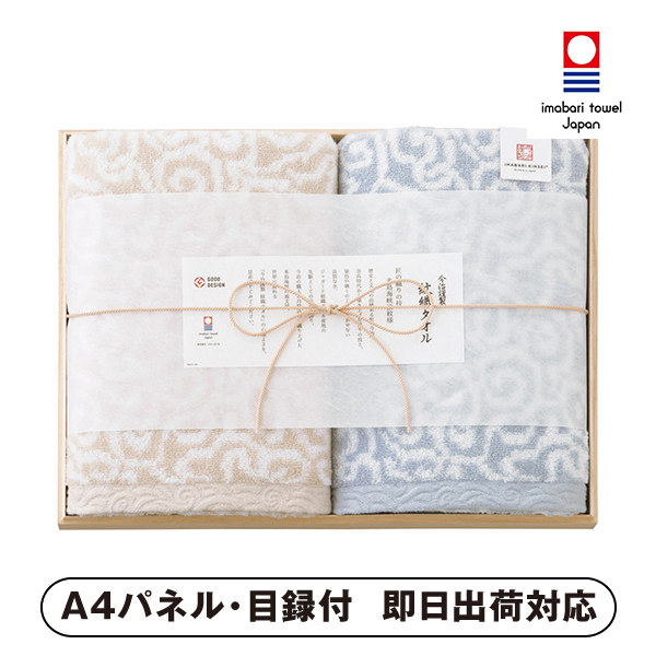 日本の伝統的な模様である唐草模様と来島海峡の荒波をイメージした波模様から着想を得た、手描きの不規則な曲線を美しく表現したタオルギフト。厳選された2種類のパイル糸を使い、ふっくらとやわらかいタオルになっています。品格を感じる木箱に入ったギフトです。