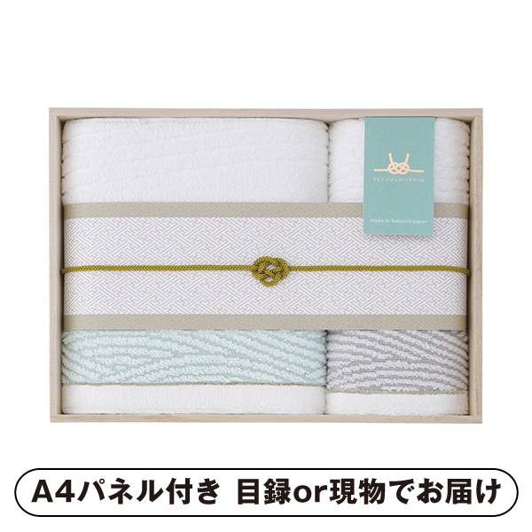愛媛県今治産「瀬戸内逸品」のバスタオルとフェイスタオルのセット。瀬戸内海をイメージした上品なデザインを木箱に収め、贈る方に高級感と心地よい肌触りを届けます。日常使いにも特別なギフトとしても喜ばれる一品です。