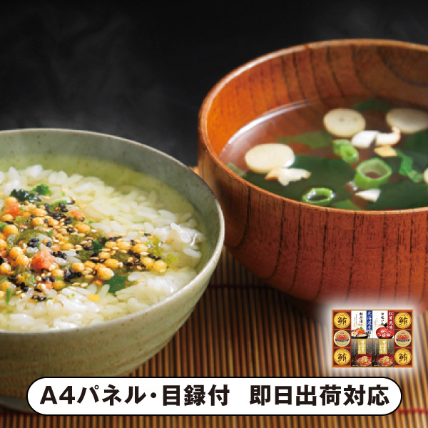 甘海老みそ汁(7.5g×3)・紅ずわいがにほぐし身55g×各2、鮪油漬フレーク70g×4、北海道産鮭茶漬け(4g×3)・永谷園松茸風味お吸い物(2.3g×4)×各1