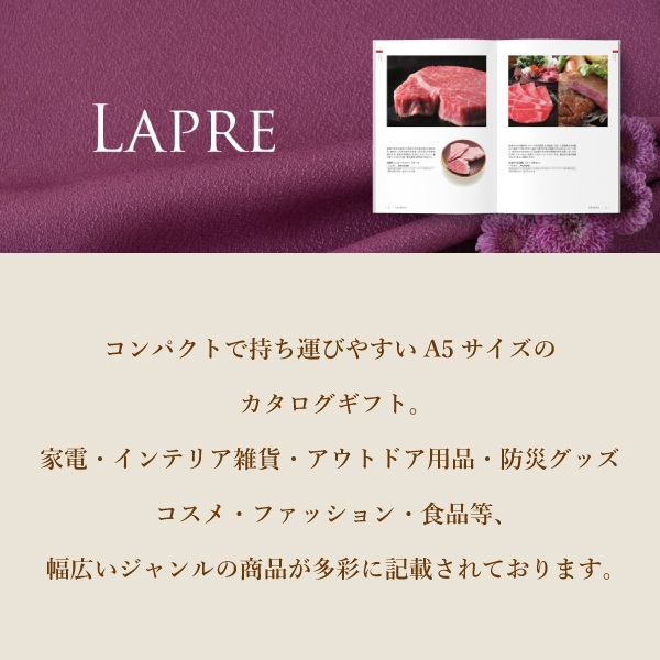 コンパクトで持ち運びしやすいA5サイズのカタログギフトです。家電・インテリア雑貨・アウトドア品・防災グッズ・コスメ・ファッション・食品など、幅広いジャンルの商品が多彩に掲載されております。