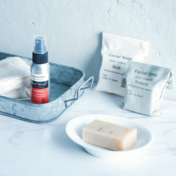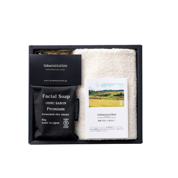 【奥州サボン プレミアム(とてもしっとりタイプ)】 保湿成分を多く含む、玄米発酵由来の「米もろみ粕」を贅沢に入れ、米ぬか、ホホバ、椿などの厳選した植物オイルをバランスよく配合しました。コールドプロセス製法で仕上げた熟成洗顔石けんは、豊かな泡立ちで、洗い上りもしっとり。素材ならではのお米の香りです。 自然の恵みと発酵のサステナブルなサイクルから生まれるファーメンステーションの製品。岩手県奥州市のオーガニック玄米から丁寧に作り出される製品は、心地よい毎日を願い、より豊かなライフスタイルを提案します。エタノールの生産過程で出る粕は化粧品原料のほか、家畜のエサとしても活用。家畜のフンは畑や田んぼの肥料となり、地域で資源の循環をゆるやかに紡いでいます。ファーメンステーションは都市と地域をつなぎ、資源循環や文化をつくり続ける一員でいたいと考えています。