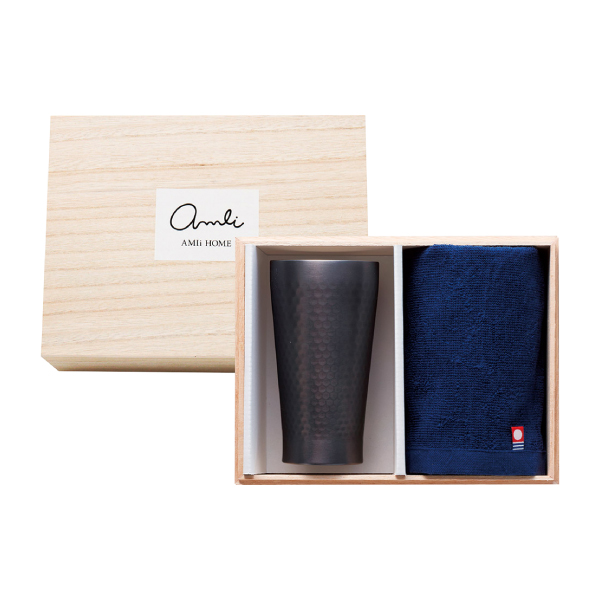保温・保冷効果に優れた真空二重構造のステンレスタンブラーと、吸水性に優れる今治タオルをセットにしました。