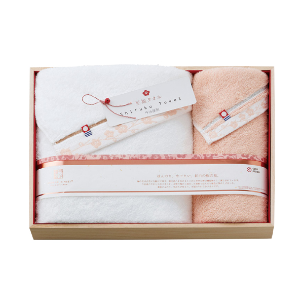 令和の元号と縁が深い「梅」でていねいに染め上げられた紅白のバスタオルとフェイスタオルのセットです。本物の梅から抽出した染料でほんのり梅色に染め上げやさしい風合いに仕上げています。糸を甘撚りにすることで柔らかい手触りに仕上げ、手にしたときの軽やかさとふんわり感が伝わるタオル。肌に触れるものだから品質にこだわり、心をこめて美しい木箱にやさしくそっと詰めました。