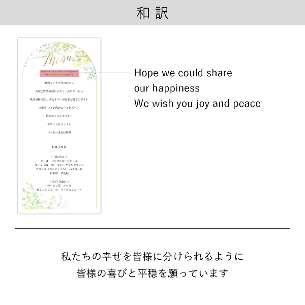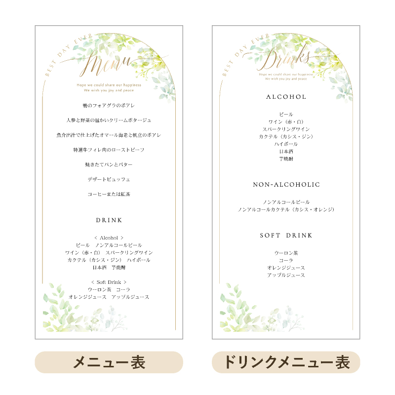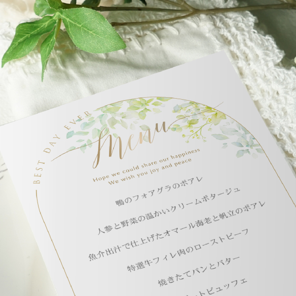 おふたりを祝福するアーチにナチュラルな水彩の爽やかなグリーンを結婚式テーマに合わせて選ぶことで統一感が増し、おふたりの世界観も同時にふんわり包み込むような優しい印象に。上品さとリッチ感もプラス。会場に女性のような煌びやかさも散りばめるメニュー表に。
