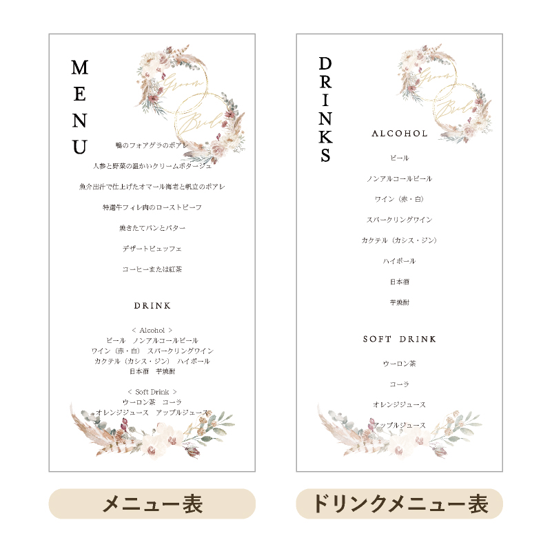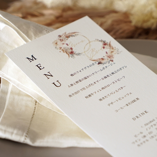 リースブーケは途切れのない輪の形から“幸せがずっと続きますように”という想いが込められています。ナチュラルなフラワーデザインは、やわらかくふんわりとした雰囲気をつくるので、アットホームな最高の日を過ごせることでしょう。