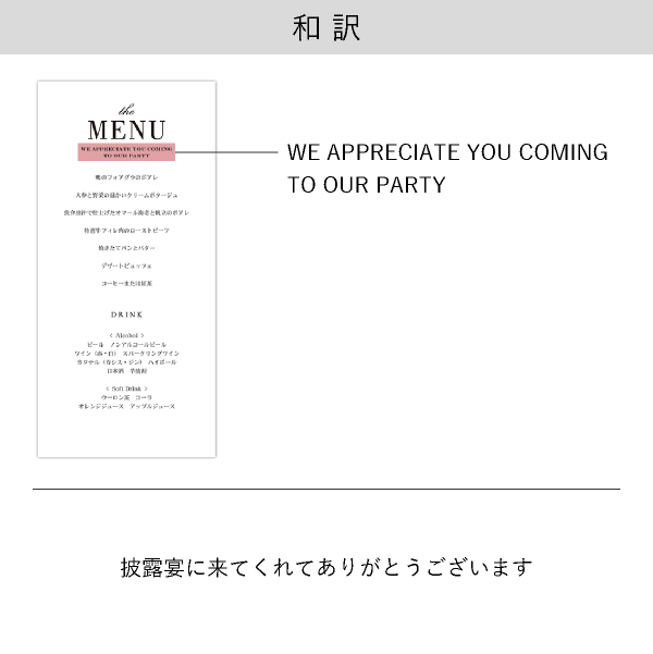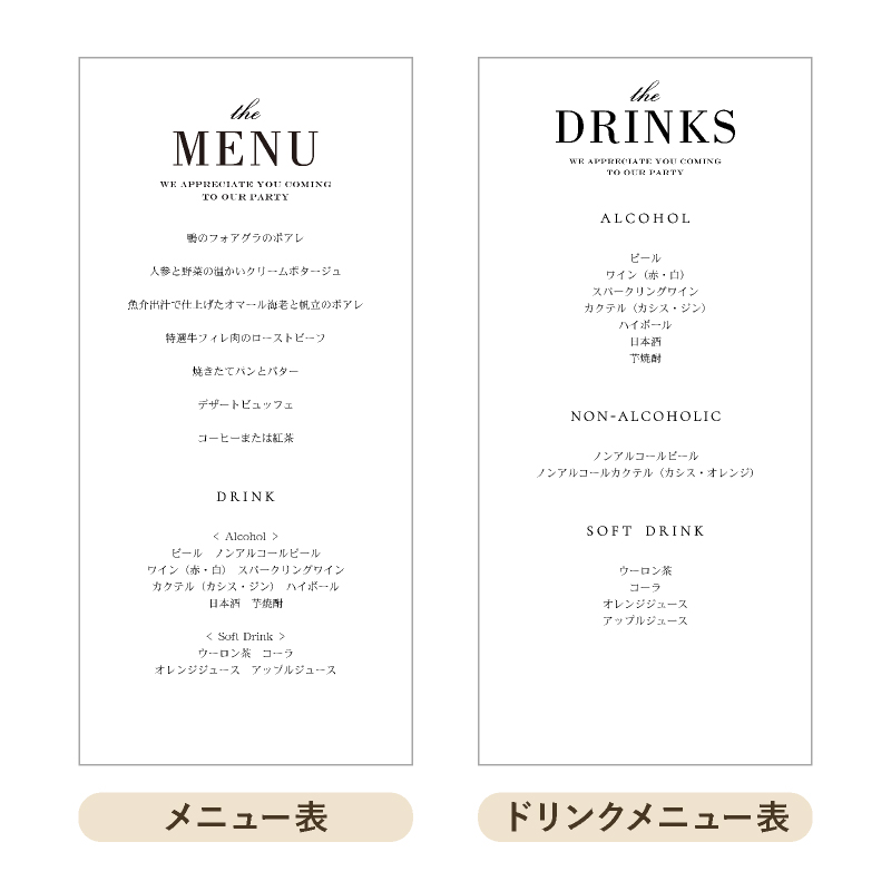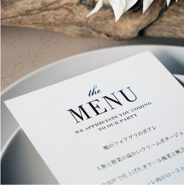 どんなテーマのテーブルコーディネートでも合うスタイリッシュさで、おふたりの未来が輝かしく表現できそう。シンプルなブラック色のメニュー表だからコンサバ系とモダン系の両面で落ち着いた大人な雰囲気をゲストへ贈ります。