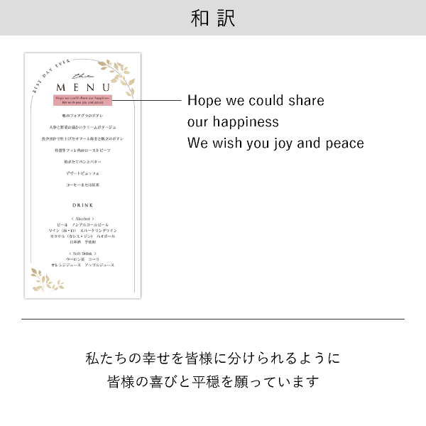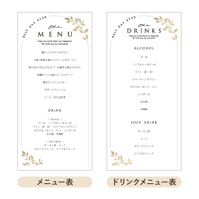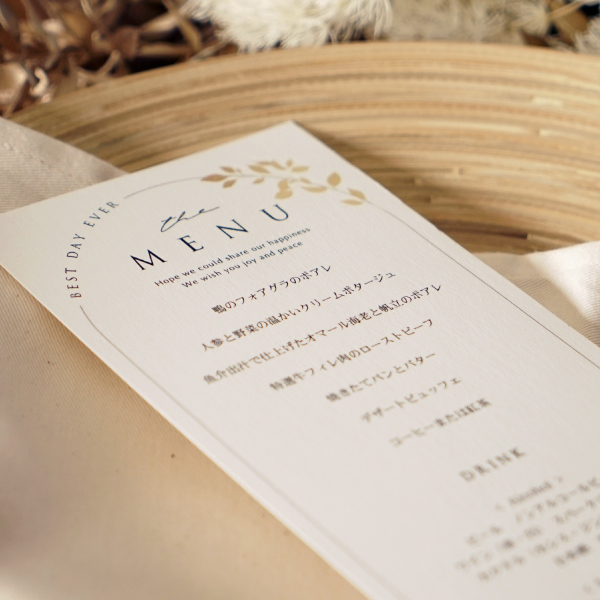 木漏れ日がかった小枝リーフがおふたりを包み込んでいるかのようで、どこかナチュラルさとぬくもりを感じます。ホワイトベースだからナチュラル且つシンプルに演出できそう。席次表とメニュー表など一体型で作成できるピアリーの席次表に、タイムラインや、プロフィールなど様々な内容を多く載せたい時、メニュー表を別に作ることもできます。テーブルレイアウトを素敵に演出したり、お料理のメニューもすぐにチェックできます。