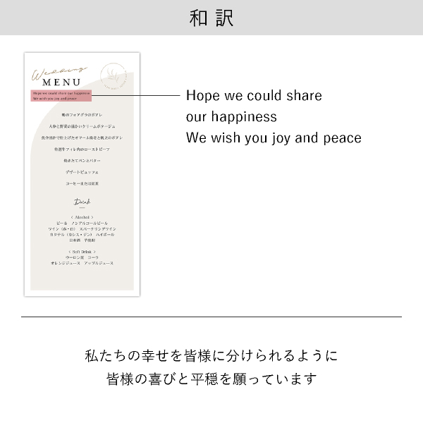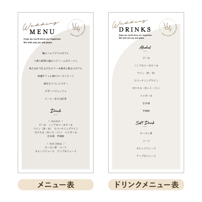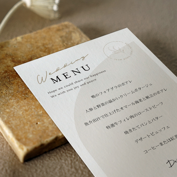 やわらかいホワイトベースのくすみカラートーンはゲストへの優しさと思いやりを感じます。シンプルなフォルムに穏やかでナチュラルな色合い、そして甘さ控えめが大人っぽさを演出します。席次表とメニュー表など一体型で作成できるピアリーの席次表に、タイムラインや、プロフィールなど様々な内容を多く載せたい時、メニュー表を別に作ることもできます。テーブルレイアウトを素敵に演出したり、お料理のメニューもすぐにチェックできます。