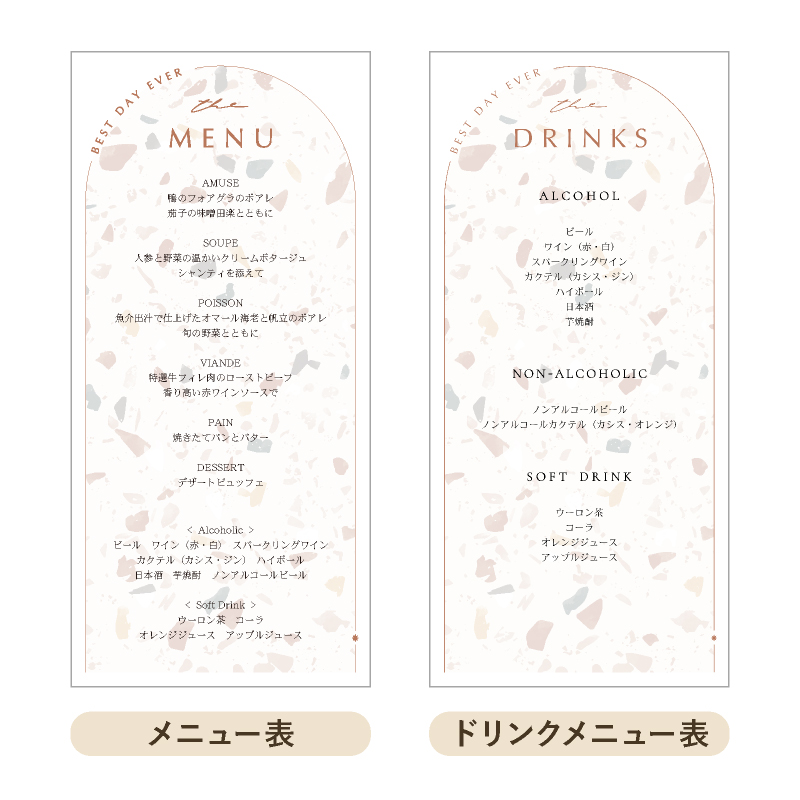 席次表とメニュー表など一体型で作成できるピアリーの席次表に、タイムラインや、プロフィールなど様々な内容を多く載せたい時、メニュー表を別に作ることもできます。テーブルレイアウトを素敵に演出したり、お料理のメニューもすぐにチェックできます。