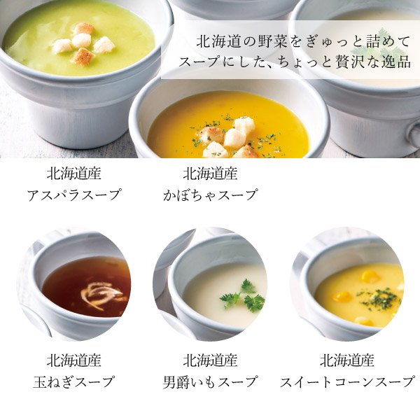 海と大地の恵みに包まれる、パスタとスープの贅沢なセット。サケがアクセントの濃厚クリームソースと、蟹の風味豊かなトマトソースパスタのパスタの食べ比べをお楽しみいただけます。スープは「かぼちゃ」「玉ねぎ」「男爵いも」「スイートコーン」「アスパラ」の5種類。北海道の野菜の美味しさをぎゅっとスープに詰めました。食卓に美しい彩りを大切な人へ。