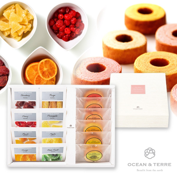 みずみずしさを残したドライフルーツと、太陽の恵みをぎゅっと一層一層に詰め込んだフルーツバームクーヘンのセットです。ドライフルーツは「ストロベリー」「チェリー」「ピーチ」「オレンジ」「マンゴー」「パイン」「アップル」「キウイフルーツ」の8種類。バームクーヘンは「栃木県産 とちおとめ苺バーム」「山形県産 さくらんぼバーム」「山梨県産 白桃バーム」「北海道産 赤肉メロンバーム」「沖縄県産 マンゴーバーム」「山形県産 ラ・フランスバーム」の6種類の彩り豊かな詰め合わせ。フルーツの美味しさを楽しめる贅沢なスイーツセットです。