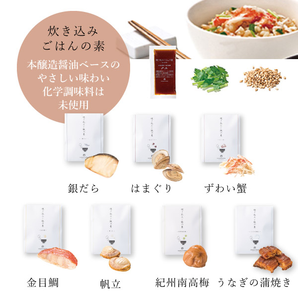 7種の炊き込みご飯が楽しめる、美しい風呂敷に包まれた炊き込みご飯の素セットです。「銀だら」「はまぐり」「ずわい蟹」「金目鯛」「帆立」「紀州南高梅」「うなぎの蒲焼き」の詰め合わせ。はまぐりは古くから縁起のいい食材として婚礼では定番の食材。結婚式の引き出物としてもおすすめです。ゴロっと食べ応えのある具材に三つ葉と白煎りごまがアクセントになり、より一層炊き込みご飯の美味しさを引き立てます。化学調味料を使用せず本醸造醤油をベースに、国産鶏、日高産昆布、焼津産鰹エキスで、風味豊かに仕上げたやさしい味わいが特徴です。