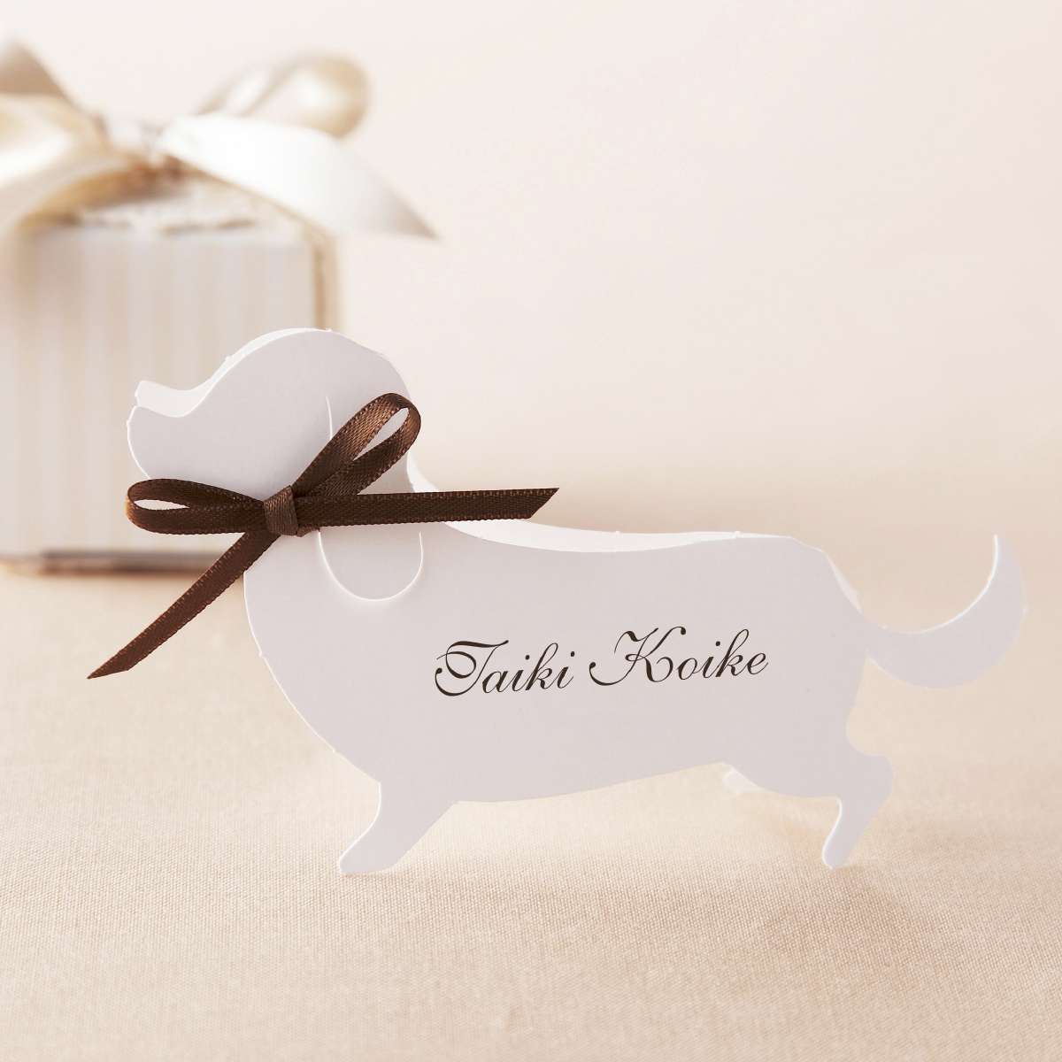 みんなが笑顔になれるようなこだわりの“おもてなし” Dogをモチーフにしたブラウンのリボンが可愛らしいペーパーアイテムでテーブルも華やかに。 キュートなデザインと愛くるしいモチーフがゲストさまへ幸せを届けてくれそう。