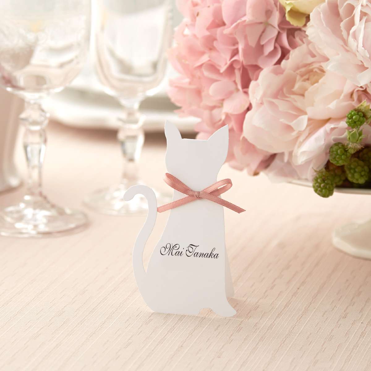 みんなが笑顔になれるようなこだわりの“おもてなし” Catをモチーフにしたピンクのリボンが可愛らしいペーパーアイテムでテーブルも華やかに。 キュートなデザインと愛くるしいモチーフがゲストさまへ幸せを届けてくれそう。