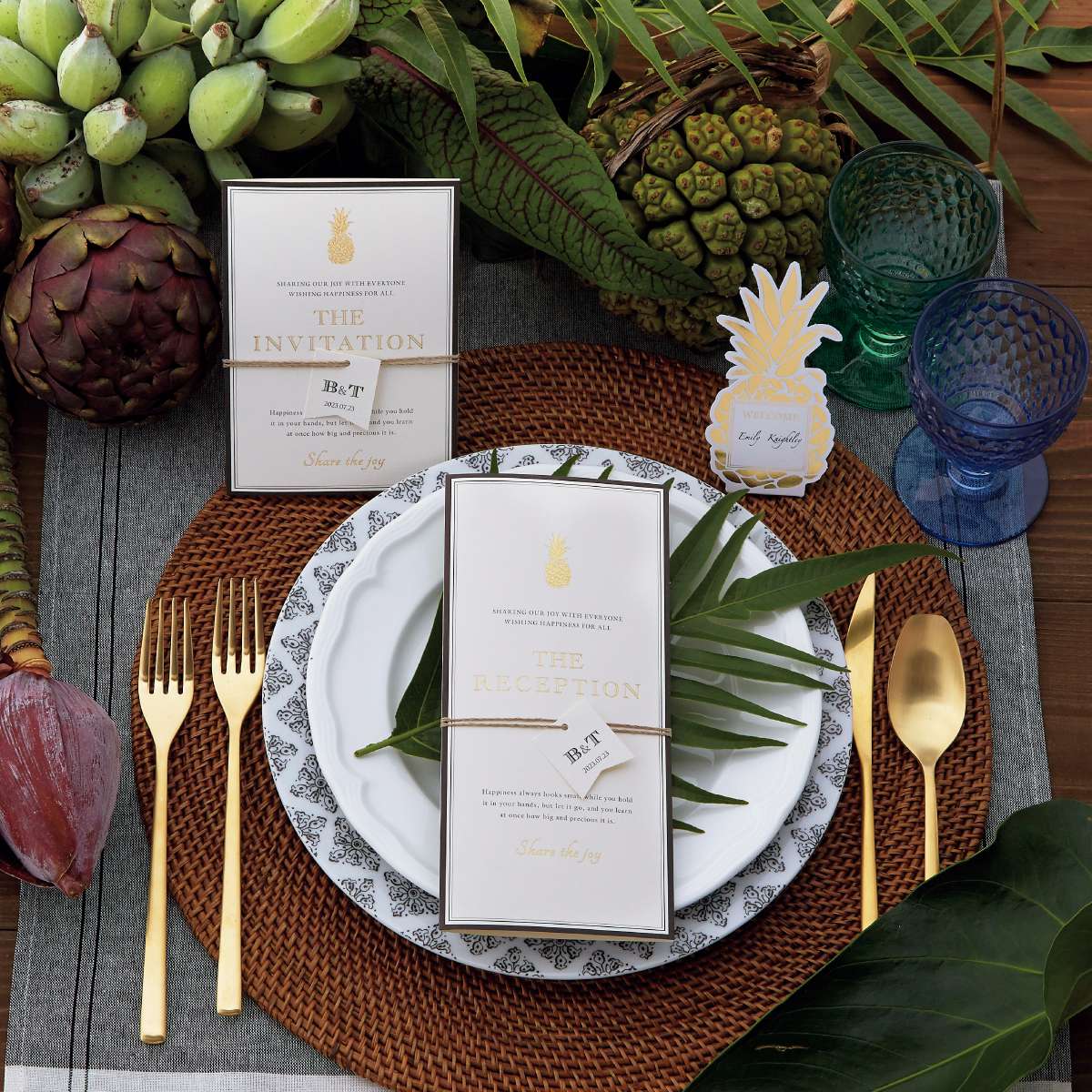 大人っぽいリゾートウェディングならコレに決まり! 黒×ゴールドのかっこよくスタイリッシュなデザインに、夏の王様パインのモチーフが夏らしくゴージャスな一枚です。 トレンド感たっぷりのタグもちょっぴりオシャレに結んで、より大人っぽくシックなウェディングを演出。
