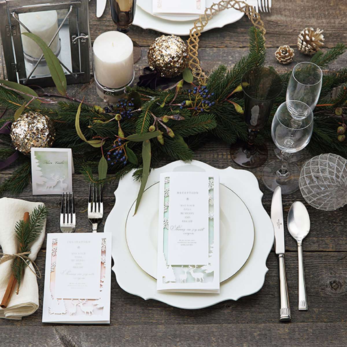 真っ白な雪景色の中にたたずむ二匹のトナカイからイメージするのは幸せなおふたりの姿。 神秘的な冬の風景をレーザー加工で表現した、繊細で美しいペーパーアイテム。 白を基調としたデザインは、繊細さと上品さを演出。