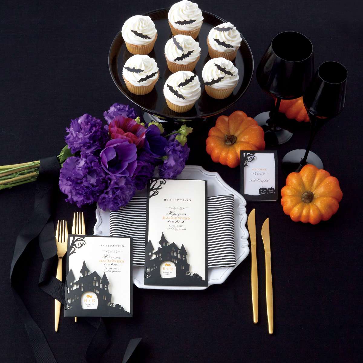 ハッピーハロウィン!ちょっぴり怪しい洋館から飛び出すのはおふたりの幸せ!? 幸せに誘われてやってきたゲスト様にユニークで楽しい時間をお届け。 ウェディングだけじゃなく、パーティーにも使える遊び心いっぱいのハロウィンデザインがオシャレな一枚です。