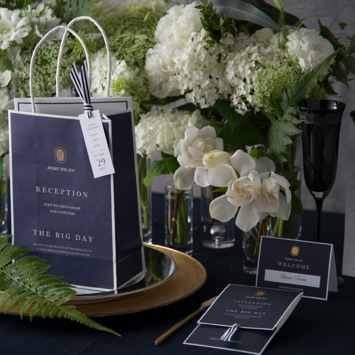 大切なゲストへの気遣いも忘れない、先輩花嫁の声から生まれた「ヒキタクバッグ」としても優秀なアイテム。 ネイビー×ゴールドのアイテムで、洗練された“特別な一日”を演出するクラス感のあるアイテム。