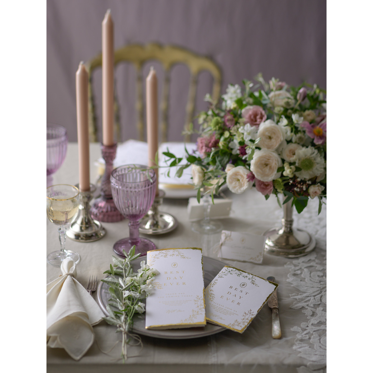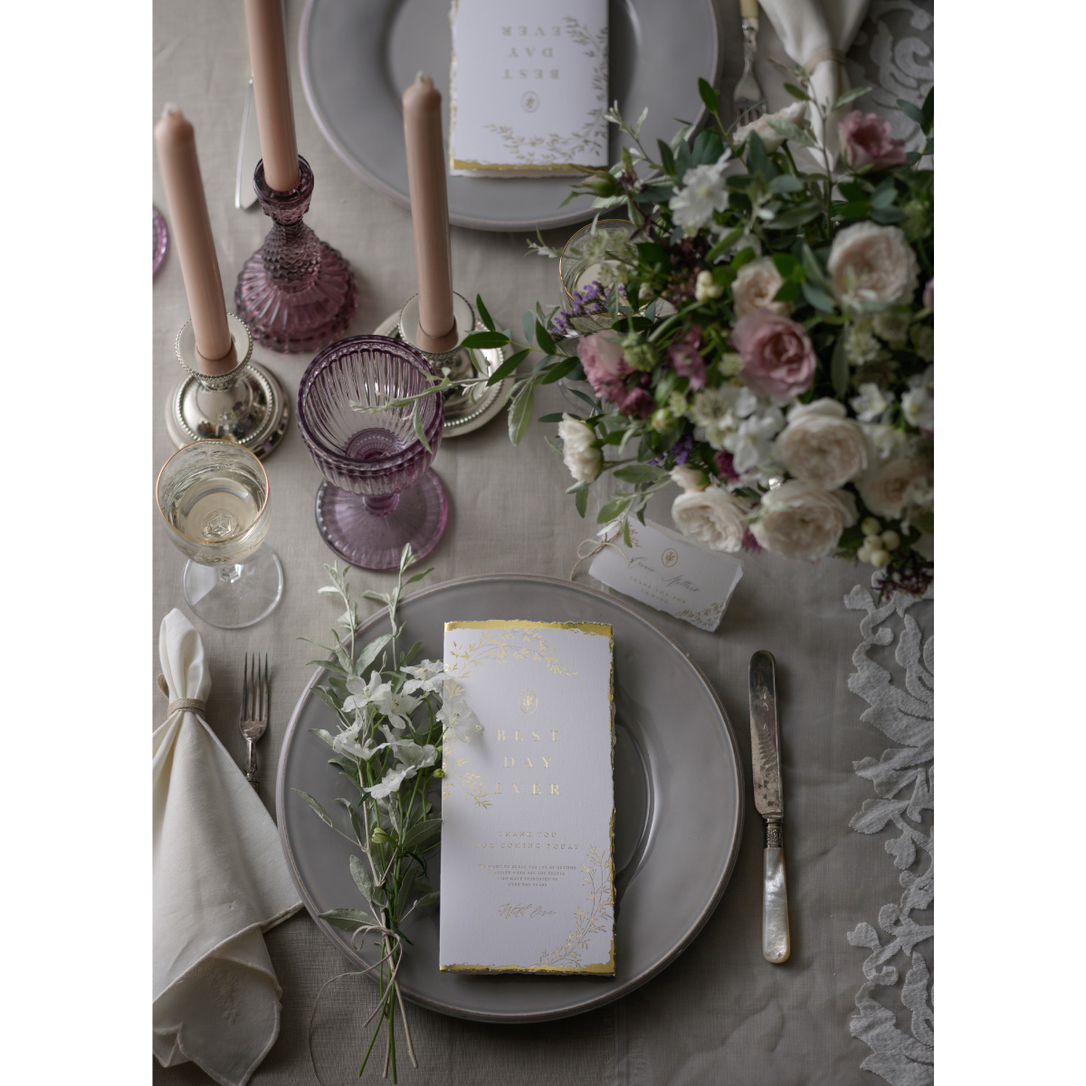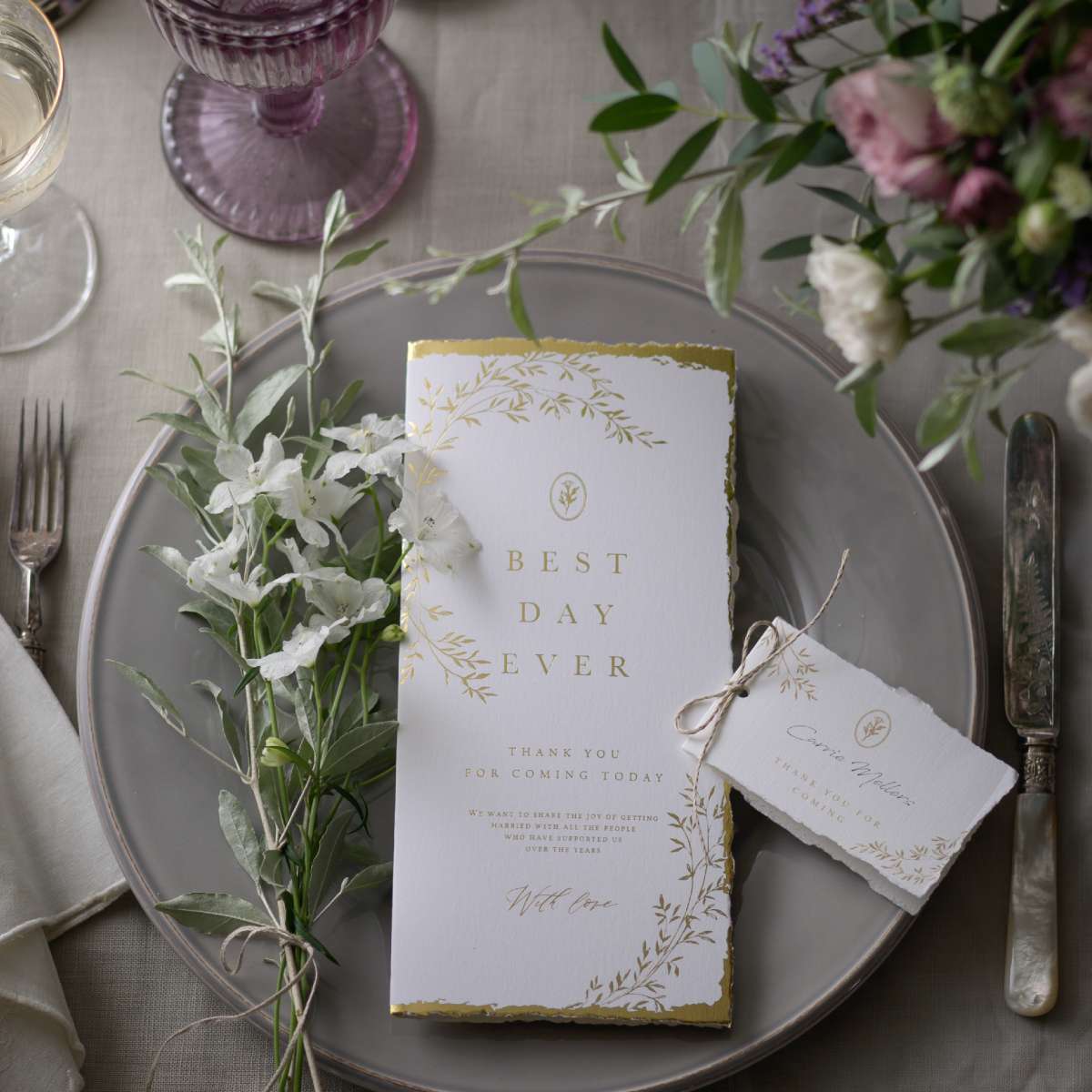 手でちぎったようなあたたかみのある紙の縁に、高級感あふれる金の箔を贅沢に施しました。 草花をモチーフにした模様や結ばれた麻ひもが、上品さの中にもナチュラルな印象をプラス。 フランス語で「幸運」の名前をもつ華やかなアイテムで、おふたりの幸せな結婚式が叶いますように。