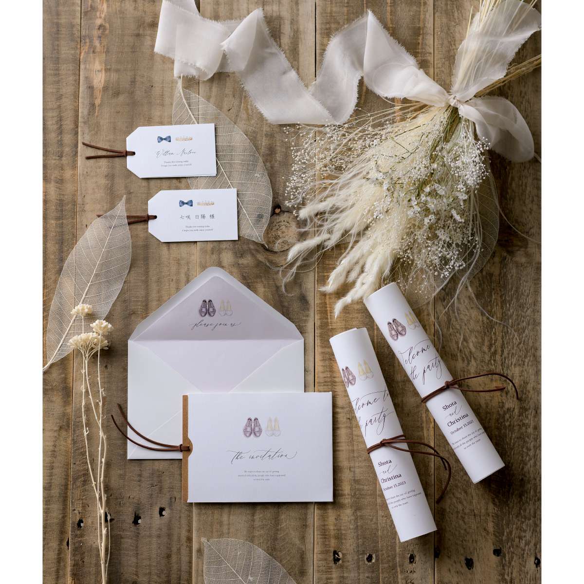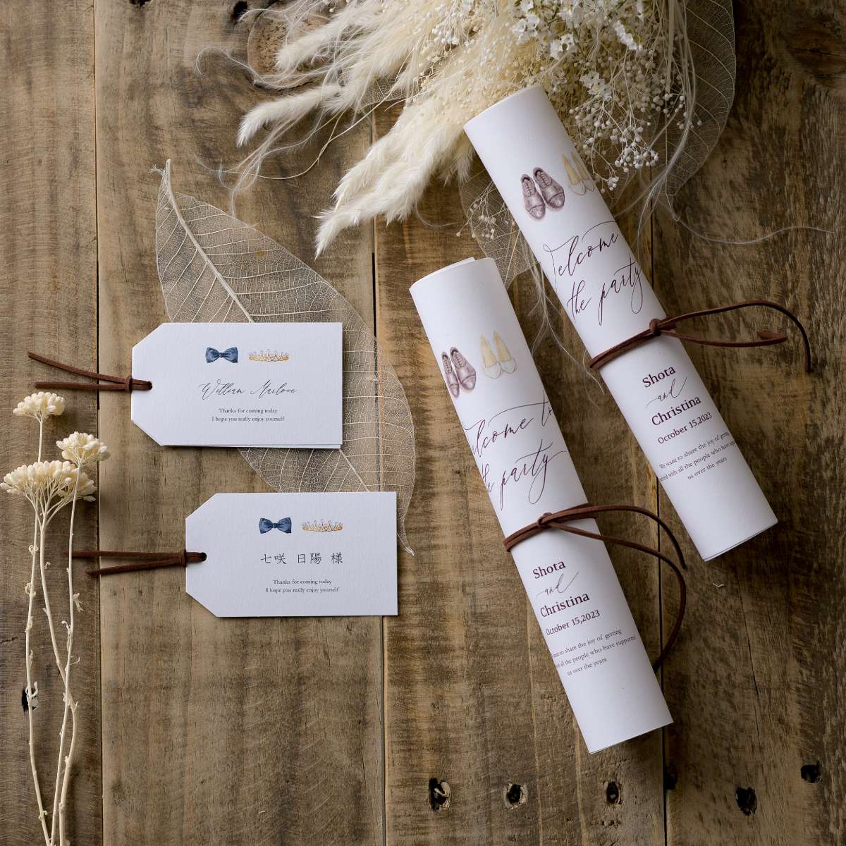 新郎さまと新婦さまが新しい人生を一緒に歩き出す、今日という大切な日にぴったりの一枚。 白い紙にシンプルに描かれたシューズやティアラが、ウェディングの雰囲気をより一層演出してくれます。 ぬくもりのあるアイテムで、ゲストさまと過ごす柔らかな時間を過ごせそうな予感。