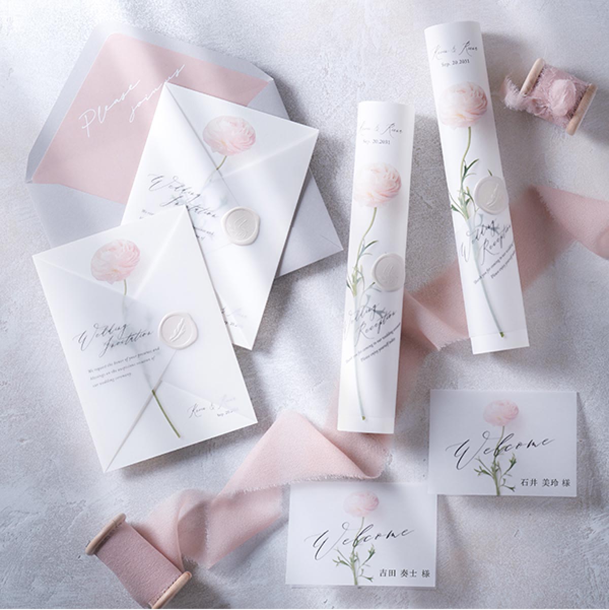 ナチュラル婚の方もエレガント婚の方も、お気に入りの花で会場を華やかに彩るアイテム。一輪の花をトレーシングペーパーに映し出すことで、さらに立体感が増し、より一層ゲストテーブルが華やかに。