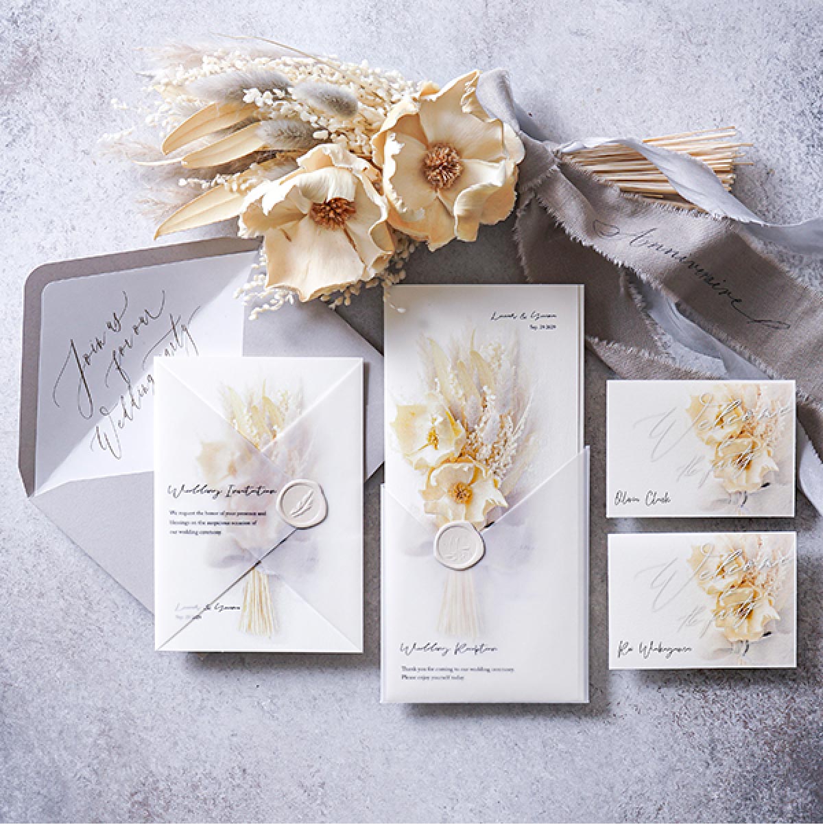 会場テーマやゲストテーブルにあわせてチョイス。立体感のあるプリントされたドライブーケでゲストテーブルを華やかに。そして優しく柔らかい印象の会場に。席札にのせてゲストさまへブーケを贈ることで幸せのおすそ分けのよう。