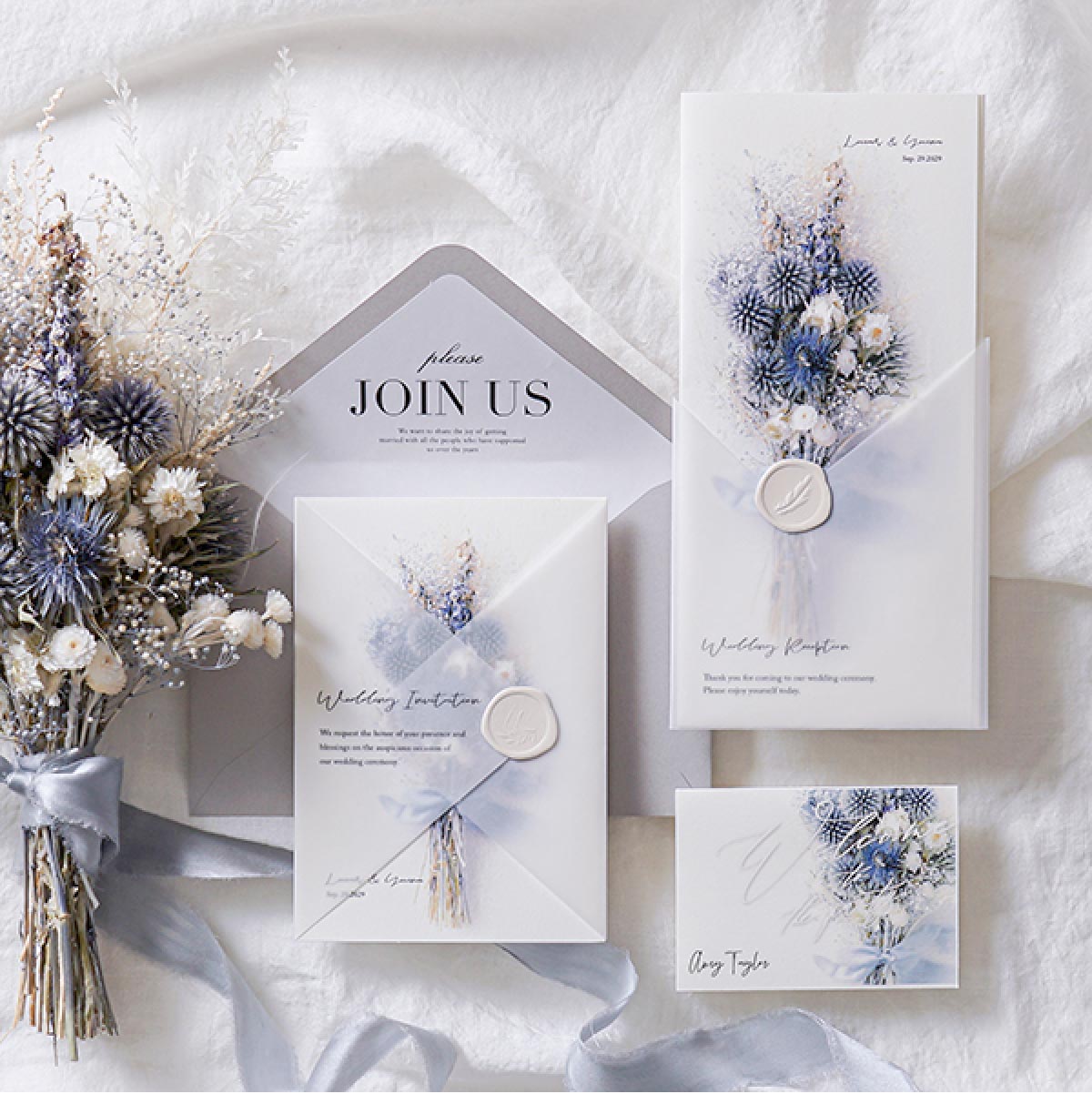 会場テーマやゲストテーブルにあわせてチョイス。立体感のあるプリントされたドライブーケでゲストテーブルを華やかに。そして優しく柔らかい印象の会場に。席札にのせてゲストさまへブーケを贈ることで幸せのおすそ分けのよう。