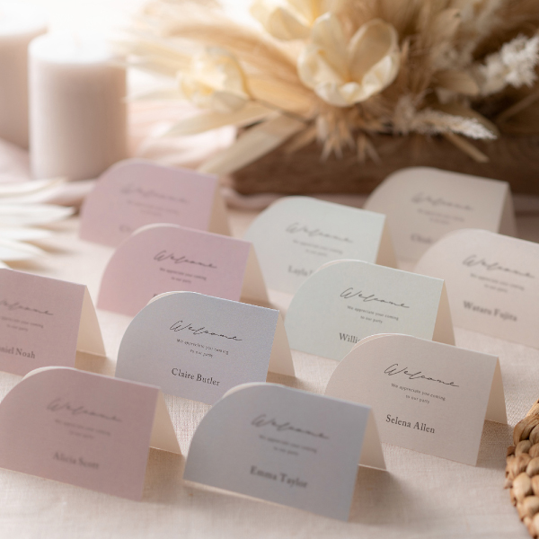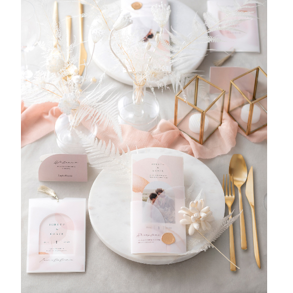 落ち着いたなじみやすいニュアンスカラー。ピンクトーンのやわらかいくすみカラートーンはゲストへの優しさと思いやりを感じます。シンプルで穏やかな装いと甘さ控えめな色合いは、どのテイストの会場にもマッチするこなれ感のある大人なトレンドアイテムです。
