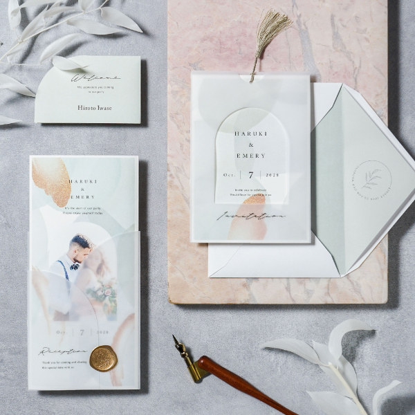 落ち着いたなじみやすいニュアンスカラー。グリーンのやわらかいくすみカラートーンはゲストへの優しさと思いやりを感じます。シンプルで穏やかな装いと甘さ控えめな色合いは、どのテイストの会場にもマッチするこなれ感のある大人なトレンドアイテムです。