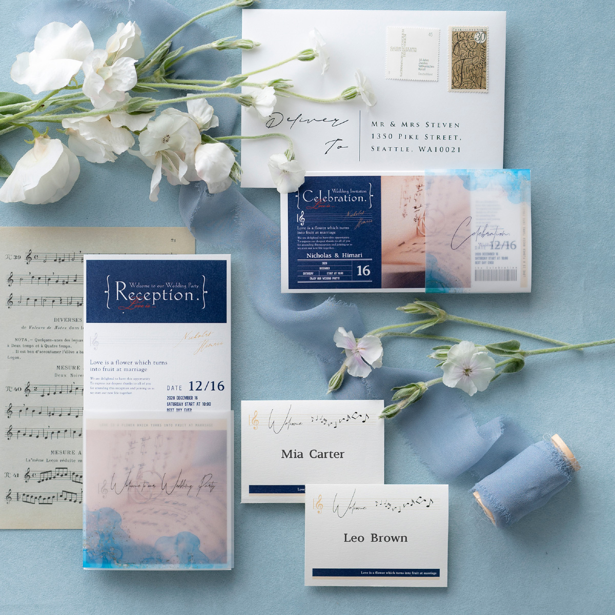 おふたりの趣味や出会いのきっかけなど、おふたりらしさを表現できるグランシリーズ!コンサート会場や演奏会など、やさしい音色が聞こえてきそうな席札。音楽好きのおふたりにぴったり!ネイビーとブラウンの2種類から選べるアイテムです。