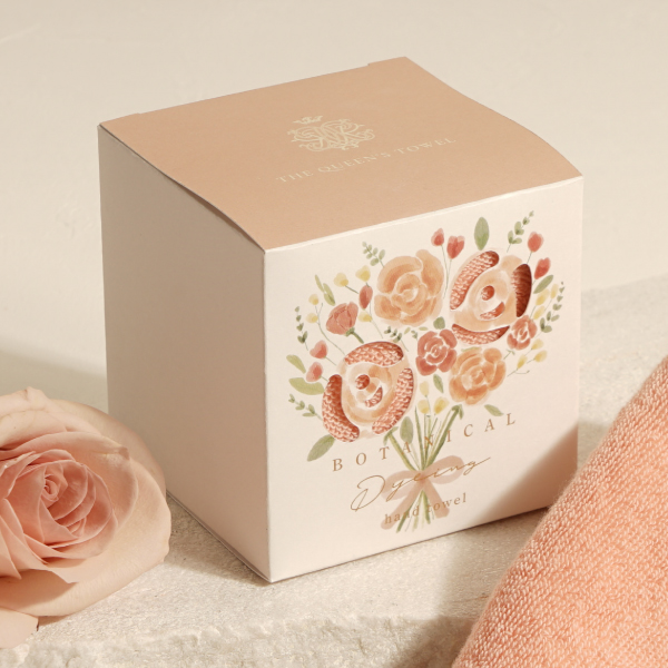 手に取るたび心が華やぐ、贈り物を。バラの花びら、葉、根、茎から抽出した染料で美しく染め上げた、ボタニカルダイ(草木染)のハンドタオルです。 『THE QUEEN'S TOWEL』は、素材から色・パッケージまで一切妥協なくこだわり抜き、「上質」と「心地よさ」を追求した大人のためのプレミアムタオル。「日々使うハンドタオルだからこそ、触れたときの幸福感や、美しいカラーを楽しめるようなタオルを作りたい」そんな想いから生まれたギフトアイテムです。 タオルカラーは、親しみやすいオーラを放つ可愛らしい印象の『コーラルローズ』。 ぱっと気持ちを明るくしてくれる、華やかな色に仕上げています。 キューブ型が特徴のパッケージにはブーケのデザインをあしらい、繊細なカットから覗くハンドタオルとの調和が美しく仕上がっています。まるでお花を貰ったような気持ちにしてくれる、優しさと華やかさが伝わるデザインにこだわりました。