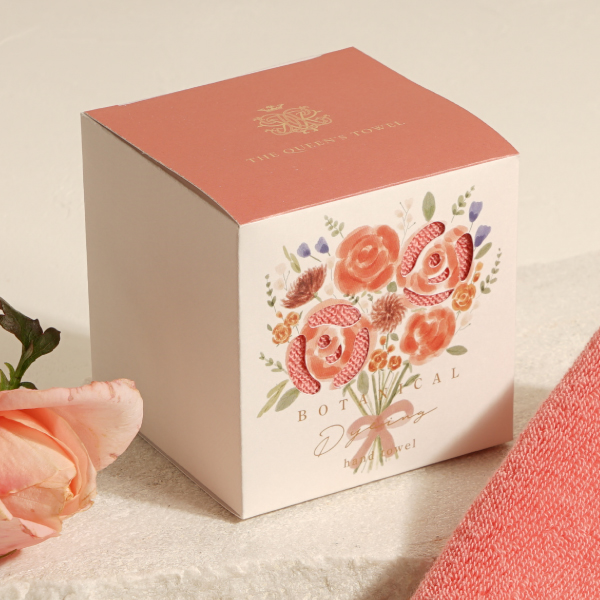 手に取るたび心が華やぐ、贈り物を。バラの花びら、葉、根、茎から抽出した染料で美しく染め上げた、ボタニカルダイ(草木染)のハンドタオルです。 『THE QUEEN'S TOWEL』は、素材から色・パッケージまで一切妥協なくこだわり抜き、「上質」と「心地よさ」を追求した大人のためのプレミアムタオル。「日々使うハンドタオルだからこそ、触れたときの幸福感や、美しいカラーを楽しめるようなタオルを作りたい」そんな想いから生まれたギフトアイテムです。 タオルカラーは、エレガントな女性らしさを演出する『ルージュローズ』。 美しさと上品さを感じる艶やかな色に仕上げています。 キューブ型が特徴のパッケージにはブーケのデザインをあしらい、繊細なカットから覗くハンドタオルとの調和が美しく仕上がっています。まるでお花を貰ったような気持ちにしてくれる、優しさと華やかさが伝わるデザインにこだわりました。