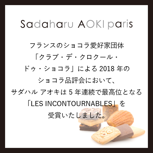 フランスショコラ愛好家団体「クラブ・デ・クロクール・ドゥ・ショコラ」によるショコラ品評会にて、5年連続で最高位となる「LES INCONTOURNABLE」を受賞したサダハル アオキが贈るスイーツ。 こだわりの製法で作り上げた5種類の焼き菓子を詰め合わせたギフトセットです。 バターの香りとキャラメルが食べ応えのある「フロランタン ナチュール」、ほろっと崩れる食感豊かな「サブレ ノワゼット」、サクッとした食感が自慢の「マカロン ラスク」など、5種類の味がお楽しみいただけます。 フランス産発酵バターやフランス産の小麦など、こだわりの素材を使用しアトリエで丁寧に焼き上げています。素材選びはもちろん、素材を混ぜる温度やオーブンから取り出すタイミングなどにもこだわり、美味しいお菓子作りに励んでいます。手土産にもちょうど良いサイズは、お礼やお返しにもおすすめです。