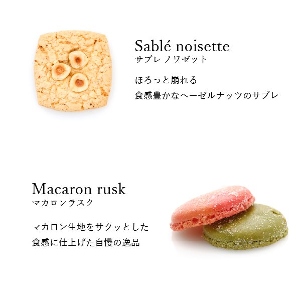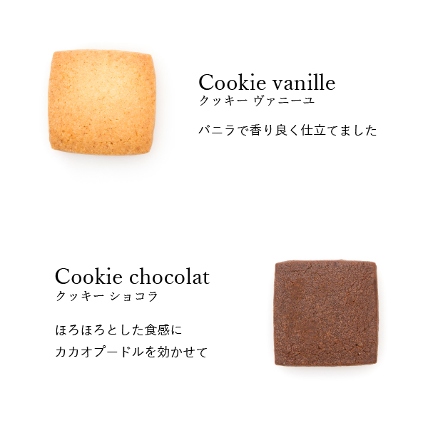 | 商品内容 | クッキー(ヴァニーユ×1・ショコラ×2)、フロランタン ナチュール×1、サブレ ノワゼット×1、マカロン ラスク×2 |