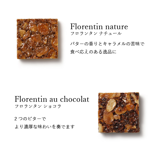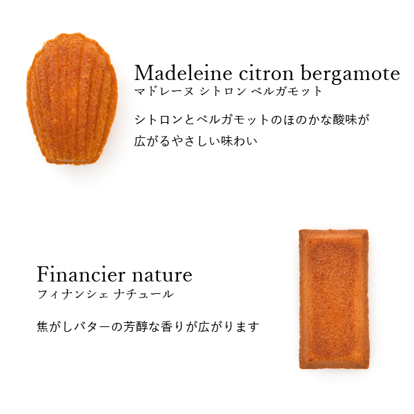 | 商品内容 | クッキー(ヴァニーユ・ショコラ×各1)、フロランタン(ナチュール・ショコラ×各1)、サブレ ノワゼット×2、マドレーヌ シトロン ベルガモット×3、フィナンシェ ナチュール×3、マカロン ラスク×8 |