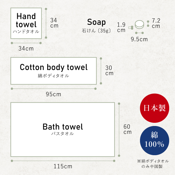 商品内容 バスタオル(60×115cm)・ハンドタオル(34×34cm)・綿ボディタオル(30×95cm)・石けん3P(35g)