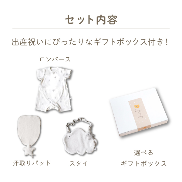 シンプルなお星さまがちりばめられたロンパースと、汗取りパット、スタイがセットになったオリジナルギフトセットは出産祝いにぴったりなアイテム♪オリジナルギフトボックスに入れてお届けします!