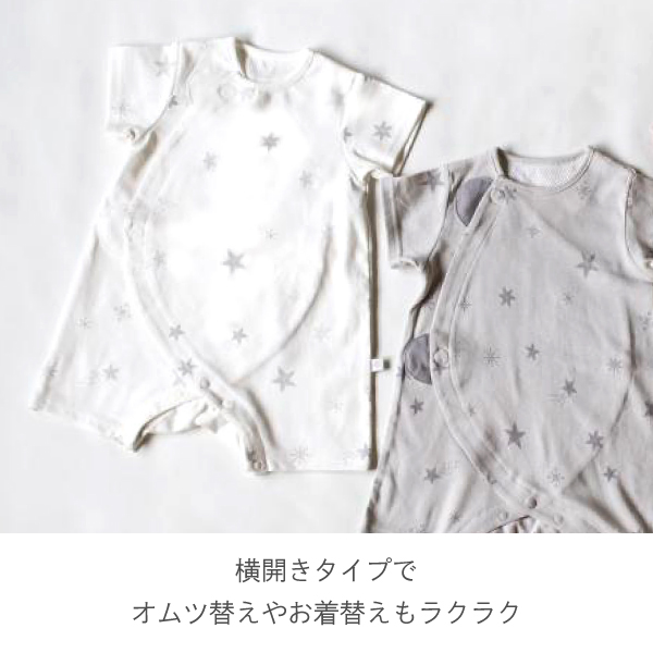 シンプルなデザインは、おしゃれママの間でも大人気♪白地に大小さまざまな星がプリントされており、男の子にも女の子にも使いやすいデザインです。横開きでオムツ替えや、着替えもラクラク!