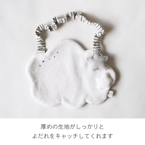 ふわふわ感が伝わってくる雲のデザインに、星のマスコットがついてオシャレ感をプラス♪厚みのあるデザインで、しっかりとよだれをキャッチし、大切な洋服を守ってくれます。シンプルなデザインは、どんな装いにも合わせやすいのも嬉しいポイントです。