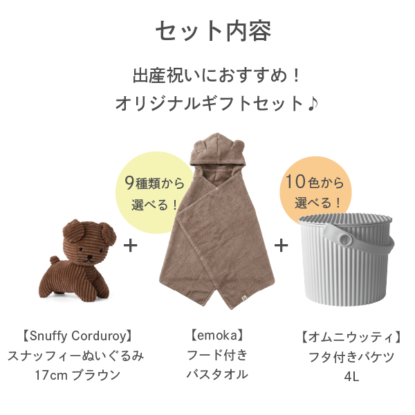 みんなが大好きなぬいぐるみ×出産祝いにおすすめなもらって嬉しいアイテム!一家に一個は欲しい!収納やスツールとしても使えるフタ付きの万能バケツ「オムニウッティ」のオリジナルギフトセットです♪