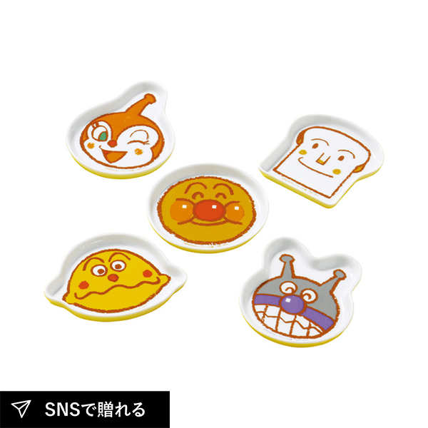 | アンパンマン小皿(約90×85×10mm)・しょくぱんまん小皿(約80×85×10mm)・カレーパンマン小皿(約105×80×10mm)・ばいきんまん小皿(約80×90×10mm)・ドキンちゃん小皿(約85×105×10mm)×各1 |